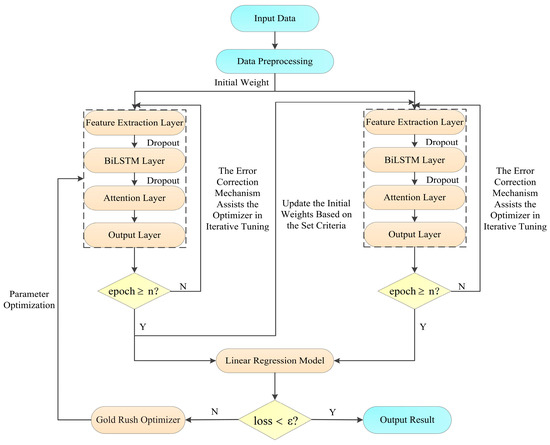 During the iterative optimization process, the mistake correction mechanism assists the adaptive optimization algorithm in adjusting model parameters. The linear regression model maps the aggregated outputs of all base learners to the final result. The gold rush optimizer is used to search for the optimal values of four key structural parameters: the number of neurons in the BiLSTM hidden layer, the two independent Dropout discard rates, and the weight update interval value. The main reason for this is that having too many hidden layer neurons may cause the model to overfit, while too few may fail to adequately capture the complexity of the time series. If the Dropout discard rate is set too low, it will not effectively prevent overfitting; conversely, if set too high, it may lead to underfitting of the model. Similarly, if the weight update interval is too small, it will not effectively contribute to the model’s correction; if too large, it may introduce new attention biases. Only with appropriate parameter settings can the model be ensured to have good predictive performance. The search ranges are [20, 136], [0, 0.3], [0, 0.3], and [5, 20], respectively. These ranges were based on the parameter settings in multiple papers in related fields and were finalized with the specific needs of this study. The optimization goal of the gold rush optimizer in the experiment is to find the minimum cumulative sum of the four evaluation metrics. Throughout the optimization process, the number of neurons in the BiLSTM hidden layer and the weight update interval are rounded to integers when input into the model.
