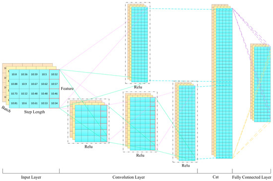 In the feature mining process, the model’s deep representation learning capability plays a crucial role in the accuracy of prediction results. Traditional single-layer one-dimensional convolutional neural networks have limitations in deep feature representation, making it difficult to fully capture the global information of the data. Especially when dealing with industrial data characterized by non-stationarity and strong coupling, it can easily lead to the loss of key information and degradation of representation capabilities. To address this issue, we propose a dual-channel convolutional neural network architecture, as shown in Figure 4. In this architecture, the single-layer one-dimensional convolution is responsible for capturing shallow feature information, while the three-layer stacked one-dimensional convolution focuses on mining deep abstract feature information. The two convolution modules work in collaboration to ensure the comprehensiveness and consistency of feature extraction. Furthermore, to overcome issues such as vanishing gradients, the ReLU activation function is used to introduce nonlinearity, ensuring that gradients can propagate effectively through the network. Finally, a fully connected layer is employed to integrate the extracted information, improving the computational efficiency of the model.