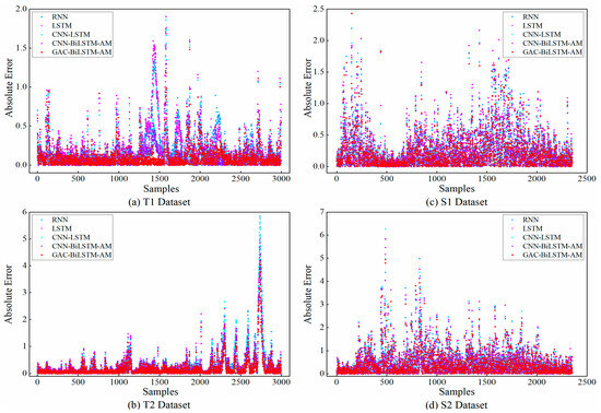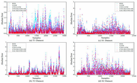 As can be seen from Table 3, on average, the prediction abilities of RNN and LSTM were very close to each other and did not present a situation where a certain model had an absolute advantage. However, the prediction accuracy of CNN-LSTM was improved compared to LSTM in some tasks, indicating that LSTM could handle complex patterns in the data more efficiently with the help of features extracted from CNN, but its generalization ability and stability were relatively weak. To address this, the CNN-BiLSTM-AM model was further optimized to enhance its versatility. As indicated in the table, the mean indexes of CNN-BiLSTM-AM were better than those of the other three comparative methods in most cases. Our model, when compared to CNN-BiLSTM-AM, achieved a maximum additional improvement in R2 of 0.018, with corresponding reductions in MAE, RMSE, and SMAPE by 0.0499, 0.0552, and 0.2409, respectively, demonstrating superior predictive performance. When shifting from single-step prediction to multi-step prediction, although the prediction accuracy and stability of all models generally decrease, our model exhibits a relatively low decrease, which further validates its advantages in dealing with the long-term dependencies of time series data. The scatter plots of the absolute prediction errors of the models in the single-step and multi-step prediction tasks for the T1, T2, S1, and S2 datasets are shown in Figure 5 and Figure 6, respectively. As shown in these figures, the prediction values of our model were closest to the real values. The comparison of the absolute prediction error curves for the two models with the best performance in single-step and multi-step forecasting tasks on the ETTh1 dataset is shown in Figure 7. This figure shows that the prediction error of our model was still the lowest in most cases, which is consistent with the results in Table 3.