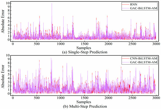 With multi-step prediction, the prediction accuracy of RNN decreases more significantly compared to single-step prediction, and its MAE, RMSE, and SMAPE are improved by 38.1%, 67.96%, and 37.72%, respectively, and R2 is reduced by 1.06%. This situation arises because RNN gradually encounters the long sequence dependence issue as the input step size increases. In contrast, CNN-BiLSTM-AM and GAC-BiLSTM-AM have demonstrated better performance than RNN. Primarily, these model alleviates long-sequence dependence and information overload issues. This is achieved by leveraging the synergy between the attention mechanism and the information stored in the cell state. A comparison of the two models’ multi-step prediction results is depicted in Figure 9. As seen in the figure, the latter model exhibits a superior fitting effect, which is mainly attributable to GAC-BiLSTM-AM’s ability to perform more comprehensive information analysis, thereby ensuring the model achieves higher prediction accuracy.
