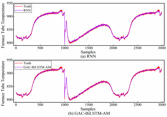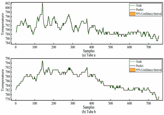 The experimental results show that for tube a, the MAE is 0.2629, the RMSE is 0.4895, the R2 is 0.9702, and the SMAPE is 0.0332; for tube b, the MAE is 0.1761, the RMSE is 0.3978, the R2 is 0.9882, and the SMAPE is 0.0223. The required running times for each are 11.53 s and 10.96 s, respectively. The prediction results are presented in Figure 11. As can be seen from the figure, the model’s predicted values closely match the actual values, with the maximum prediction error being within 2 °C. This can provide a reliable reference for the relevant staff to grasp the changes in temperature in advance. Furthermore, the time expenditure also satisfies the requirements of practical applications. Consequently, applying our method to predict the cracking outlet temperature in ethylene cracking furnaces holds significant practical relevance.