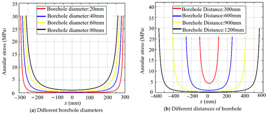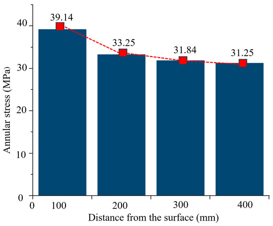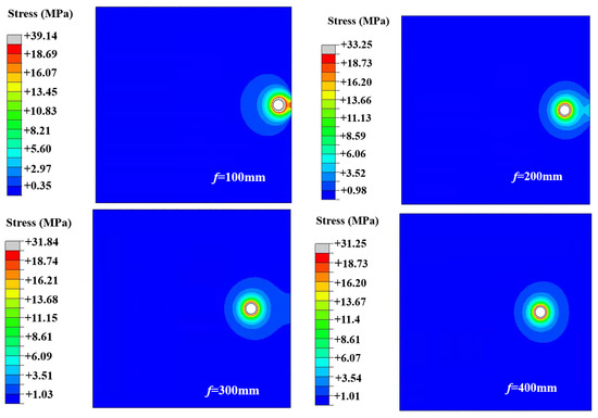 - At a free surface distance f = 100 mm, the annular stress of the proximal free surface (y = 0) reaches 39.14 MPa, yielding a stress concentration factor Kt = 1.3 (normalized to the internal expansive pressure Pex = 30 MPa). A progressive weakening of stress concentration is observed with increasing f. At f = 200 mm, annular stress reduces to 33.25 MPa, representing a 15.05% decrease compared to the f = 100 mm case. At f = 400 mm, stress further diminishes to 31.25 MPa, achieving a 20.16% reduction relative to the baseline scenario.
