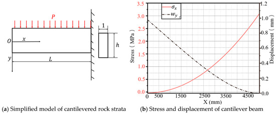 - The cantilever beam model reveals the gradient evolution law of roof fracture. The results indicate that bending stress increases gradually with the growth of and reaches its maximum value at the restrained end of the cantilever beam—the compressive stress. The cantilever beam deflection achieves its maximum value at the free end.