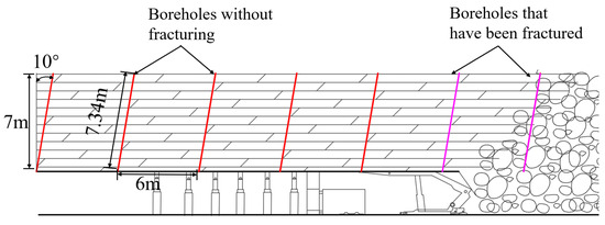 - The optimization study of expansion pressure parameters shows that the stress doubling effect of a single rock layer significantly changes the stress distribution around borehole due to expansion pressure (Pex = 30 MPa). The peak stress reaches 86.34 MPa, which is 242.73% of the mining pressure condition (35.57 MPa) and 156.98% of the compressive strength of the rock mass ( = 55 MPa). For multi-layer coordinated deformation, the peak stress reaches 66.12 MPa, which is 413.25% of the mining pressure condition (1.60 MPa). An on-site industrial application verified technical reliability; after adopting the drilling scheme with a 75 mm diameter and a 6 m spacing, the hanging roof area at the end of the mining face is reduced to below 20 m2.
