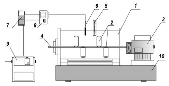Thermostat unit with 4 autoclaves of 0.25 dm3 volume. 1: Thermostat; 2: autoclave; 3: electric motor; 4: shaft; 5: control thermometer; 6: thermocouple; 7: temperature sensor; 8: starter; 9: gearbox; and 10: base.
