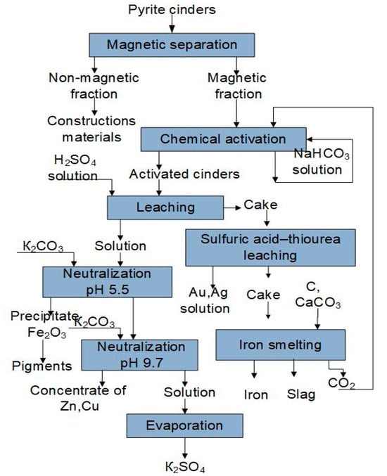 - Abikak, Y.B.; Kenzhaliev, B.K. Development of an integrated technology intended to process pyrite slag using chemical pre-activation. News Natl. Acad. Sci. Repub. Kazakhstan Ser. Geol. Tech. Sci. 2022, 3, 32–51. [Google Scholar] [CrossRef]