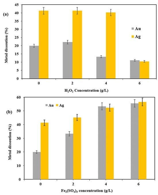 To obtain the optimal extraction conditions for Au and Ag, the effects of two different oxidizing agents (H2O2 and Fe2(SO4)3) were evaluated at a range of concentrations (0–6 g/L) based on previous studies [44,45,46,47].