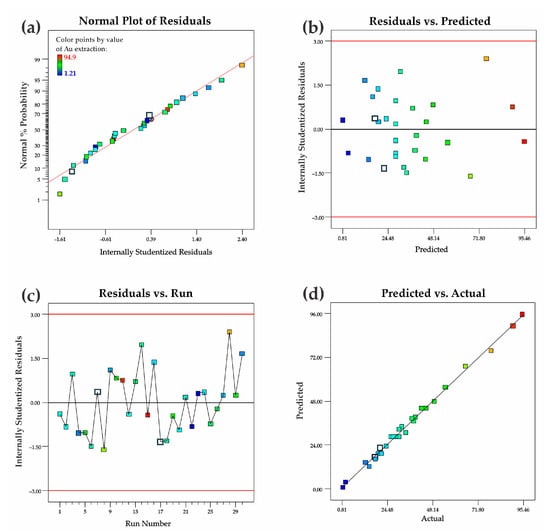 Diagnostic graphs for Au recoveries: (a) a plot of normal probability vs. the internally studentized residuals, (b) internally studentized residuals vs. the predicted responses, (c) internally studentized residuals vs. run number, and (d) predicted responses vs. the actual values.