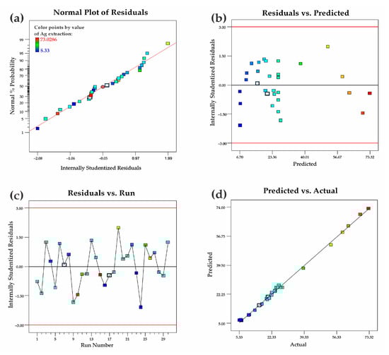 Diagnostic graphs for Ag recoveries: (a) a plot of normal probability vs. the internally studentized residuals, (b) internally studentized residuals vs. the predicted responses, (c) internally studentized residuals vs. run number, and (d) predicted responses vs. the actual values.