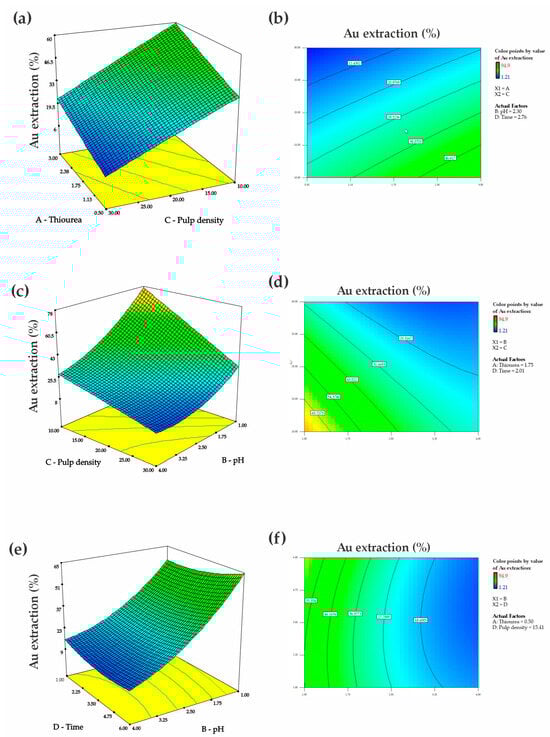 Three-dimensional plots showing the interacting variables for Au leaching: (a) interaction between the thiourea concentration and the pulp density; (b) contour diagram of the effect of thiourea concentration and pulp density on Au extraction (c) interaction between the pulp density and the solution pH; (d) contour diagram of the effect of pH and pulp density on Au extraction (e) interaction between the leaching time and the solution pH (f) contour diagram of the effect of pH and leaching time on Au recovery.