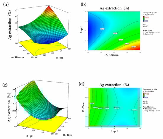 Three-dimensional plots showing the interacting variables for Ag leaching: (a) interaction between the thiourea concentration and the solution pH; (b) contour diagram of the effect of thiourea concentration and pH on Ag extraction (c) interaction between the leaching time and the solution pH (d) contour diagram of the effect of pH and leaching time on Ag extraction.