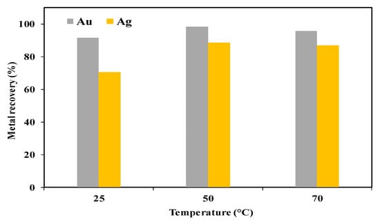 As reported in previous studies [32,53], the temperature significantly affects the recovery of both Au and Ag from such systems. Therefore, two additional experiments were conducted at 50 and 70 °C using the optimal parameters defined above (Figure 8).