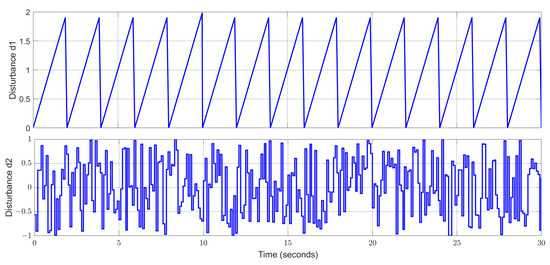 The input signals are In this section, MATLAB/Simulink [58] is used as a simulator to simulate the dynamic responses of the interconnected system and the proposed observer. The unknown input disturbances are depicted by Figure 1.