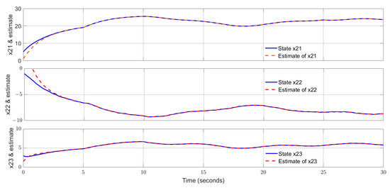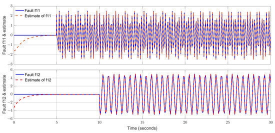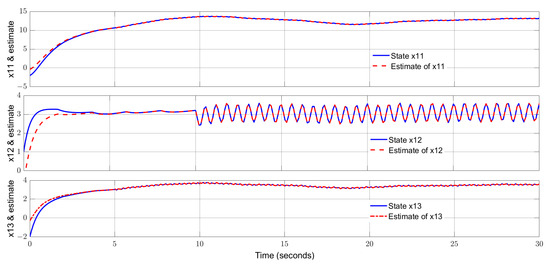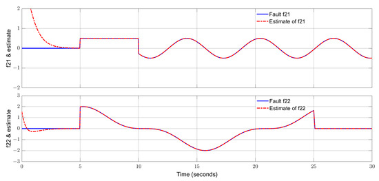 In the simulation, the initial states of the two subsystems are and , respectively. Select the parameter The curves of the states and their estimates for subsystem 1 are shown by Figure 2. The trajectories of the additive actuator faults and their estimates for subsystem 1 are displayed by Figure 3. The states and their estimates for subsystem 2 are exhibited by Figure 4, and the actuator faults and their estimates for subsystem 2 are drawn in Figure 5. From Figure 2, Figure 3, Figure 4 and Figure 5, one can notice that the estimated signals can track the real signals well. More specifically, the states of two subsystems are reconstructed excellently and the additive actuator faults are successfully estimated with high accuracy. The impacts from the uncertainties on the estimated curves are alleviated successfully, showing a strong robustness of the proposed observer. Moreover, both high-frequency and low-frequency fault signals are reconstructed excellently, indicating a wide applicability of the proposed estimator.
