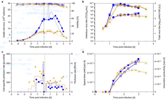 - Vazquez-Ramirez, D.; Jordan, I.; Sandig, V.; Genzel, Y.; Reichl, U. High titer MVA and influenza A virus production using a hybrid fed-batch/perfusion strategy with an ATF system. Appl. Microbiol. Biotechnol. 2019, 103, 3025–3035. [Google Scholar] [CrossRef]