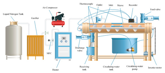 To address the need for small-scale experimental torrefaction pretreatment of corn straw, this study designed an independently controlled and highly adaptable spiral reactor for conducting corn straw torrefaction experiments. Figure 1 illustrates the system diagram of this spiral torrefaction apparatus. To ensure the air-tightness of the entire apparatus during the torrefaction process, it is advisable not to have an excessive number of thermocouples; however, the selected testing locations should be both representative and specific. Therefore, in this experimental setup, three specific temperature measurement points were selected, namely, the solid material outlet and the nitrogen hot carrier gas inlet and outlet, to measure the reactor’s operating temperature under different conditions. Additionally, to enhance heat transfer efficiency, a sleeve is installed outside the spiral reactor, with uniform flow holes near the inlet. The installation of the sleeve allows for the efficient release of heat carried by the nitrogen hot carrier gas. Specifically, when the high-temperature nitrogen gas enters the equipment, it needs to fill the entire sleeve before coming into contact with the material inside the spiral, thereby enhancing heat transfer efficiency. The placement of uniform flow holes helps prevent uneven heating caused by excessive pressure inside the sleeve. Furthermore, because standard electric motors cannot meet the low rotational speed requirements of this experiment, a gearbox is installed to control the motor and precisely adjust the speed of the spiral.