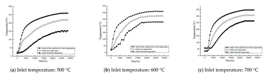 Before conducting formal experiments, it is necessary to perform a trial run and equipment debugging, hence the no-load thermal state experiment. The experimental results, showing the variation of the reactor temperature over time at different inlet air temperatures, are displayed in Figure 3. From this, it can be observed that at different inlet temperatures, the temperature variations among various measurement points at the same time follow the order of outlet temperature of the uniform flow hole > outlet gas temperature > outlet material temperature. This is due to the flow path of nitrogen gas inside the spiral reactor. Specifically, the high-temperature hot air first enters the casing before entering the inner tube in the spiral heater. When the casing is filled with gas, it flows through the orifice plate into the inner tube. Since the nitrogen gas outlet is located at the top, and during the no-load heating debugging process, the lower valve is tightly closed, nitrogen gas can only be discharged from the upper outlet. As the nitrogen gas flows and releases heat within the spiral heater, it causes the temperature of the nitrogen gas near the gas outlet to gradually decrease.