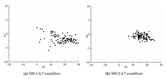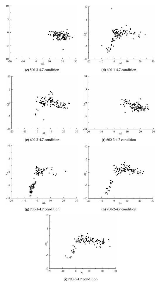 From Figure 4g–i, it can be observed that when the nitrogen hot carrier gas temperature is increased to 700 °C, corn straw enters the stage of intense torrefaction. It can also be seen from the figures that at this temperature, the color difference coordinate distribution patterns are very similar for the three processing quantities. When the processing quantity is 1 kg, the majority of brightness color differences are concentrated in the ΔL range from −10 to 0, with a few distributed in the 0–5 range, and only 6 points distributed in the ΔL > 10 range. This suggests that under this condition, it is possible to establish a complete energy balance for torrefaction, meaning that the heat generated by the combustion of volatile components during the torrefaction process is sufficient to provide the heat required for the torrefaction reaction. However, when the processing quantity increases to 2 kg, the overall coordinate distribution is scattered; however, a trend can be observed towards deviation in the direction of ΔL < 0. Furthermore, by comparing the results of the two conditions, one with a nitrogen hot carrier gas temperature of 700 °C and a processing quantity of 3 kg, and the other with a nitrogen hot carrier gas temperature of 600 °C and a processing quantity of 2 kg, it can be seen from the result plots that in the ΔL > 0 interval, they have a similar distribution. However, in the condition with a nitrogen hot carrier gas temperature of 700 °C and a processing quantity of 3 kg, there is a situation where ΔL < 0 points account for approximately 20% of the total quantity.
