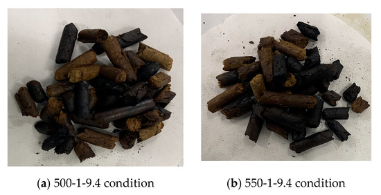 When the nitrogen hot carrier gas flow rate is increased to 9.4 kg/h, it is evident that the EY values at various temperatures are significantly different from those when the nitrogen hot carrier gas flow rate is 4.7 kg/h. After optimizing the conditions by increasing the hot carrier gas flow rate, the torrefaction effectiveness at 500 °C is better than that at 550 °C and is close to the torrefaction effectiveness at 600 °C. Furthermore, when the temperature rises to 550 °C, the torrefaction effectiveness is better than that of the condition before optimization at a hot carrier gas flow rate of 700 °C and a processing quantity of 1 kg.