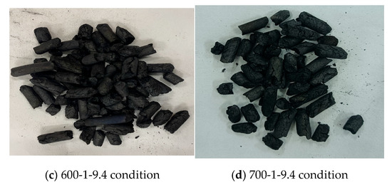 From Figure 5, it can be observed that when the temperature reaches 600 °C and 700 °C, all of the biochar has turned black, and upon weighing, it is found that this portion has experienced significant mass loss and has already undergone carbonization [21]. This indicates excessive torrefaction, and, therefore, the results from this portion are not suitable for analysis. By comparing Figure 4 with Figure 6, it can be observed that when the temperature is 550 °C and the processing quantity is 1 kg, the overall torrefaction effect is not significantly different from when the temperature is 600 °C and the processing quantity is 2 kg. However, when the processing quantity is 2 kg and 3 kg, the overall distribution is similar to that under 500 °C for 2 kg and 3 kg processing quantities, with the only difference being a relatively more scattered distribution at 550 °C. Furthermore, the conformity rate of the biochar under a gas flow rate of 4.7 kg/h at 550 °C also falls between the rates of 500 °C and 600 °C under the same gas flow rate, confirming the reliability of the obtained results.