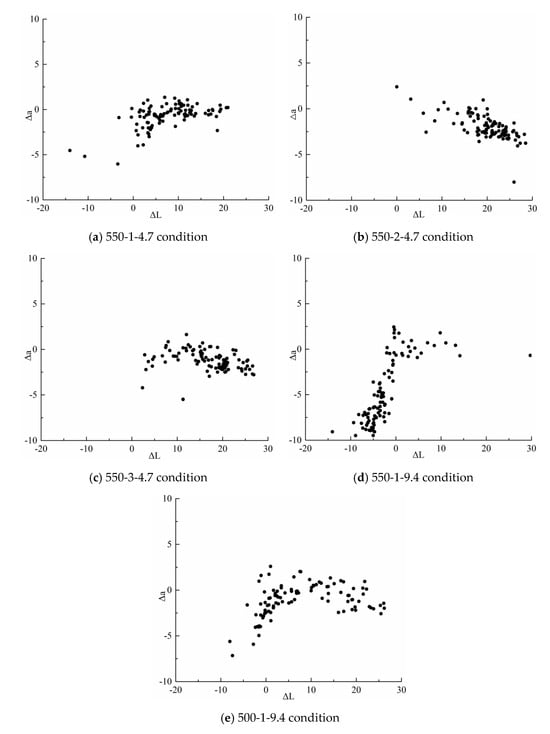 Two-dimensional color mapping of torrefied biochar obtained under various conditions before optimization. Note: ΔL and Δa are standard parameters in the CIELAB color space, and their values represent dimensionless units of color difference.