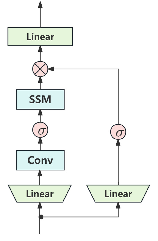 As shown in Figure 1, the unidirectional Mamba block is primarily designed for one-dimensional sequence tasks, such as time-series analysis and text identification. Among them, represents a nonlinear activation function, and ⊗ represents nonlinear multiplication. The structural inspiration for the Mamba block is mainly based on the H3 architecture and gate multilayer perceptron (MLP). The Mamba architecture achieves standardization and residual connection interleaving by repeatedly stacking Mamba blocks.