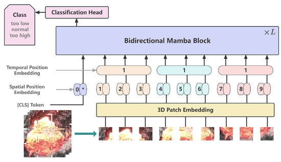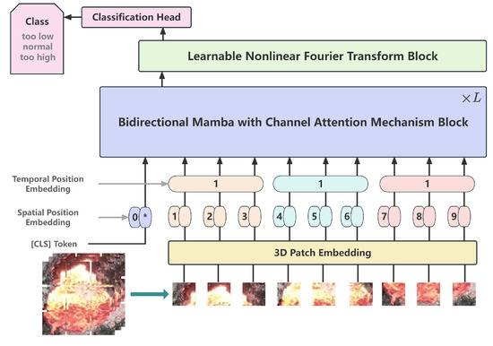 The overall framework of VideoMamba [14] is shown in Figure 4. To conduct a specific analysis of the framework, VideoMamba first uses 3D convolution to project the input video , generating L non-overlapping spatiotemporal patches , where , , and H and W represent the height and width of the fire hole video frames, respectively. Afterwards, place the learnable classification token at the beginning of the sequence. Add learnable spatial position embedding and temporal position embedding to form a new input token sequence for the VideoMamba encoder as shown in Formula (8):
