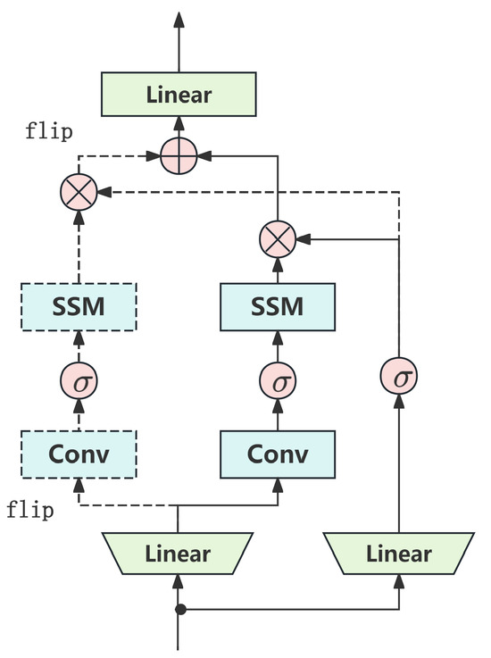 The unidirectional Mamba block, as illustrated in Figure 1, is primarily designed for one-dimensional sequential data, where its core mechanism utilizes a unidirectional state space model (SSM) to aggregate information along the sequence. However, when applied to two-dimensional image sequences or three-dimensional video data, this unidirectional modeling exhibits limited information flow, making it difficult to capture complex spatial structures and multidimensional dependencies. To address this limitation, this paper uses a bidirectional mamba (B-Mamba) structure as shown in Figure 3. Unlike the unidirectional Mamba block, B-Mamba incorporates both forward and backward SSM branches within each layer to simultaneously process visual sequences in both directions. This symmetric architecture not only enhances the capacity to capture contextual information but also significantly improves its ability to model long-range dependencies across spatiotemporal dimensions.