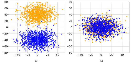 The alignment process between the latent representations of fire hole videos and the model-generated features. The yellow dots represent the features extracted from the fire hole videos, and the blue dots represent the features learned by the model. (a) The state before training. (b) The state after training.