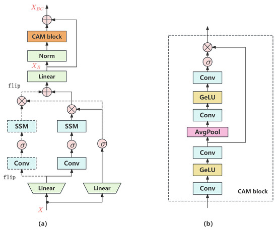 The structure of the bidirectional Mamba with channel attention mechanism (BC-Mamba) block. (a) The structure of the BC-Mamba block. (b) The structure of the channel attention mechanism (CAM) block.