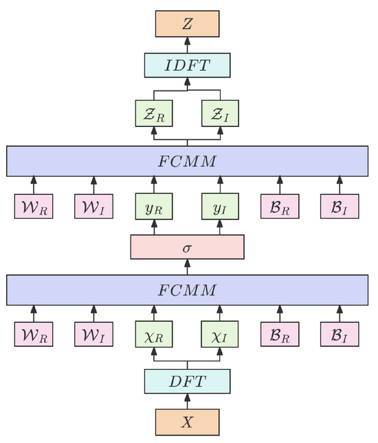 For a given time domain input X and its corresponding frequency domain signal obtained using DFT, according to the convolution theorem, the convolution operation of X in the time domain can be completely equivalent to the product operation of in the frequency domain. The equivalent formula is shown in Formula (4). Among them, ∗ represents the convolution operation, and · represents the product operation. and B represent the complex weights and biases of the time domain, while and represent the complex weights and biases of the frequency domain