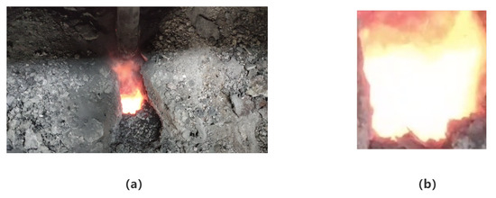 The initial fire hole video frame (a) and processed fire hole video frame (b).
