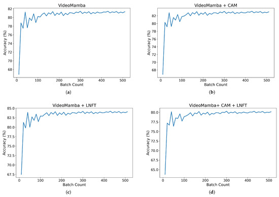 To verify the effectiveness of each block in the CFVM method, we conduct ablation experiments as shown in Table 2. From Table 2, we can see that using VideoMamba (Figure 10a) alone to train fire hole videos achieves an accuracy rate of approximately 81.7%. Compared to VideoMamba, the accuracy of VideoMamba + CAM (Figure 10b) and VideoMamba + LNFT (Figure 10c) is increased by approximately 1.5% and 2.2%, respectively. Therefore, the above three sets of experimental data validate the effectiveness of the CAM block and LNFT block in SD identification. However, as shown in Table 2, the training time for the VideoMamba + CAM combination is nearly four times longer than that of either VideoMamba or VideoMamba + LNFT. Furthermore, the number of training epochs required for VideoMamba + CAM + LNFT (Figure 10d) is approximately fifteen times that of the final model. These results show that training the attention mechanism within CAM blocks from scratch significantly increases the computational complexity of the model, thereby demanding substantially more training time. The more complex the model incorporating CAM blocks becomes, the greater the training time required.