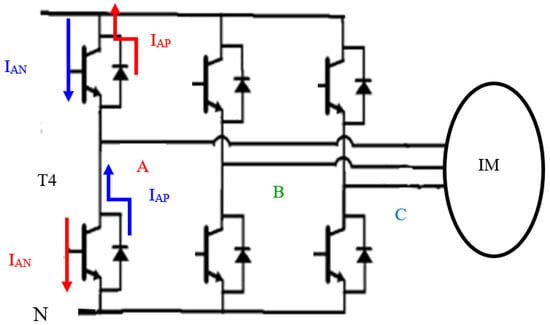 IGMFs occur because of missing one of the firing pulses. The recurrence of this fault results in an OCF. A further reason for an OCF is the failure of the isolated drive amplifier in the firing circuit. If the IGBT in an upper part of leg A is affected by an OCF, then the current conducting through phase A will pass through the bypass diode. The phase A voltage depends on switching pattern of the IGBT in a lower part of leg A and the polarity of phase A current. This leads to the addition of a DC current offset in both the faulty and healthy phases.