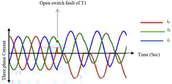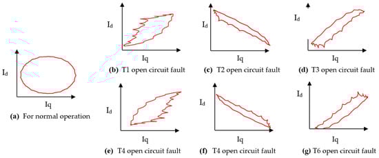 Park’s vector transform (PVT)-based OCF diagnosis method has received significant attention because of its effectiveness in real time [9,10]. PVT allows for fault diagnosis in a stationary reference frame by converting 3ϕ currents into 2ϕ direct-quadrature (d-q) components. The PVT creates a symmetric circular pattern in the d-q plane under healthy conditions of switching devices. While in the presence of OCF, the pattern becomes asymmetrical. The localization of a faulty switching device becomes possible by analyzing asymmetrical patterns.