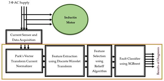 The proposed system for OCF diagnosis for 3ϕ V/F-controlled VSIs under variable load conditions at different frequencies is shown in Figure 4.