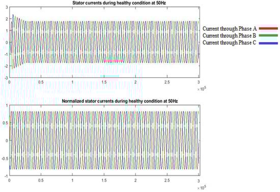 The 3 ϕ stator currents and 3 ϕ-normalized stator currents using Park’s vector modulus.
