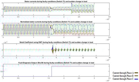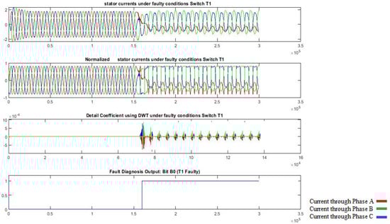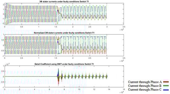 The choice of a mother wavelet is dependent on the potential for a particular application; therefore, DWT does not have a fixed mother wavelet such as other transforms like Fast Fourier Transform or Discrete Cosine Transform. The different mother wavelets give different results for the analysis of the same signal; hence, the selection of the mother wavelet and signal decomposition level is a crucial task in fault diagnosis. The commonly used mother wavelets are Daubechies (DB), Symmlet, Coiflet, and Battle-Lamarie, each performing differently. The selection of the mother wavelet is determined by parameters like symmetry, orthogonality, compact support, and vanishing moments; sometimes, multiple wavelets have similar properties, and if so, the nearest to the original signal is preferred. Another problem is choosing the correct decomposition level, which is typically determined through testing as well as understanding the pattern of data, and with the maximum level being contingent on the sample count, as the data are halved at each level. In this work, the selection of a mother wavelet is carried out based on the analysis of signals using different mother wavelets at different levels of decomposition. The DB2 wavelet was chosen for its effectiveness in analyzing non-stationary, transient signals like three-phase stator currents during fault conditions. It balances compact support, orthogonality, and vanishing moments, which are essential for detecting subtle deviations in open-circuit faults. At level 2, DB2 provided the best feature extraction for healthy vs. faulty conditions. The analysis of a non-stationary 3 ϕ-normalized stator current signal using the DB2 mother wavelet at level 2 under healthy and faulty conditions of device T1 is shown in Figure 7, which reveals that wavelet transform coefficients () clearly differentiate between the healthy and faulty conditions.
