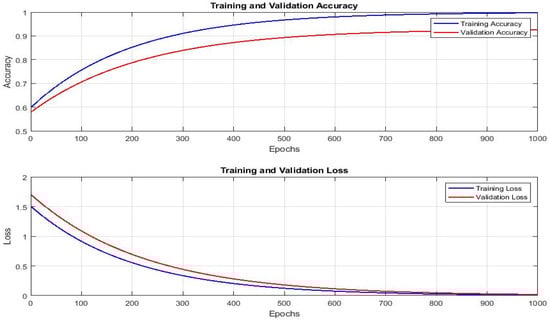 An RS was preferred for hyperparameter tuning in XGBoost due to its efficiency in exploring the hyperparameter space, reducing computation time compared to a grid search. The selected features are used to train the XGBoost model, utilizing an RS for hyperparameter optimization. The dataset comprises five features, identified by high weight scores using the RA, and standardization confirms all features remain in the same range to increase model convergence speed. The dataset is divided into three subsets: a Training Set (70%) for learning model parameters, a Validation Set (15%) for hyperparameter tuning and early stopping, and a Test Set (15%) for performance evaluation on unseen data. To optimize XGBoost, the RS capably chooses hyperparameters, comprising the number of estimators, learning rate, and maximum depth. The tested values consist of the number of estimators [50, 100, 150, 200, 250], learning rate [0.001, 0.005, 0.01, 0.05, 0.1], and maximum depth [3, 5, 7, 9]. This technique expedites tuning by minimizing unwanted evaluations while still finding an optimal model configuration. The output layer involves six classes (B0 to B5), signifying six switching device conditions (T1 to T6) in the system. This architecture permits XGBoost to capably learn complex fault patterns while confirming accurate classification performance. The training progress, including accuracy and loss reduction over epochs, is shown in Figure 8.