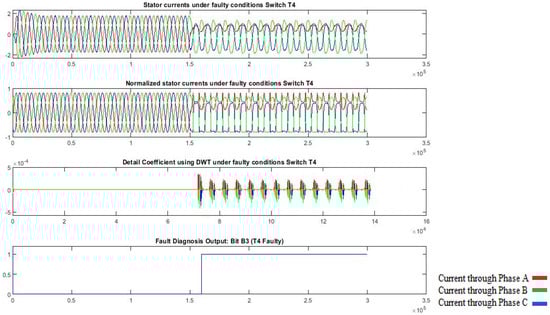 Results regarding the time-domain waveforms of the three-phase currents, the normalized currents, XGBoost model-processed output, and the diagnosis result of T4 open-circuit fault.