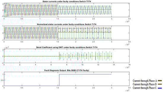 Results regarding the time-domain waveforms of the three-phase currents, the normalized currents, XGBoost model-processed output, and the diagnosis result of T1-T4 open.