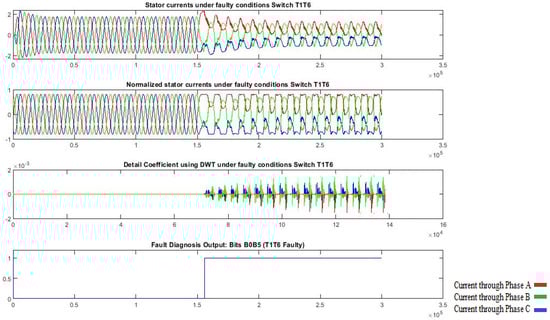 Results regarding the time-domain waveforms of the three-phase currents, the normalized currents, XGBoost model-processed output, and the diagnosis result of T1-T6 open.