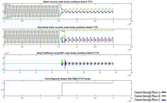 Results regarding the time-domain waveforms of the three-phase currents, the normalized currents, XGBoost model-processed output, and the diagnosis result of T1-T3 open.