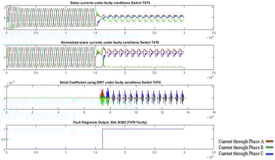 Results regarding the time-domain waveforms of the three-phase currents, the normalized currents, XGBoost model-processed output, and the diagnosis result of T4-T6 open.