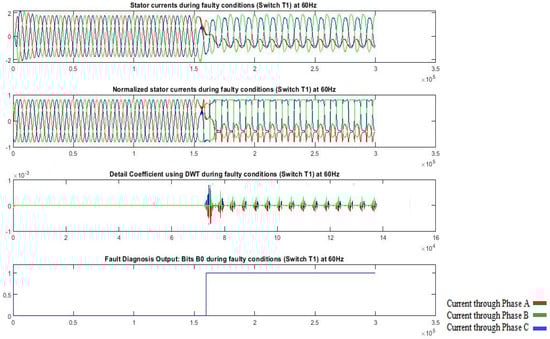 Figure 16 shows the results for a T1 open-circuit fault at a 60 Hz frequency. The change in operating frequency affects the fundamental component of the current waveforms, which could potentially impact the fault diagnosis mechanism. Nevertheless, the proposed method successfully adapts to this frequency change, maintaining an accurate fault diagnosis. The normalized currents display the characteristic pattern of a T1 fault, and the XGBoost model-processed output precisely identifies this condition without any misclassification. The detection time is around 20 ms. This demonstrates the versatility of the method in handling frequency variations while preserving its diagnostic accuracy.