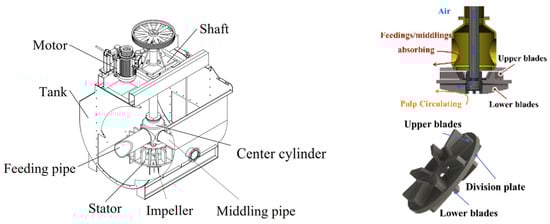 The conventional forced-air self-aspirating flotation machine and its impeller are shown in Figure 1. The impeller incorporates two types of blade with independent working zones, i.e., the impeller is divided into upper and lower blades separated by a disk to create distinct functional areas. Compressed air supplied through the hollow shaft enters the lower-blade zone, where the lower blades circulate pulp within the tank and disperse air. Simultaneously, the upper blades generate localized negative pressure to pump feeding or middling streams. This configuration resolves the critical challenge of enabling the impeller–stator system to achieve negative-pressure suction of feeding/middling in a positive-pressure aeration environment while maintaining internal pulp circulation [47]. By integrating these dual functions, the forced-air self-aspirating flotation machine addresses the conflicting requirements of slurry transport and hydrodynamic stability under pressurized operating conditions.