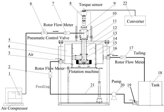 The 200 L forced-air self-aspirating flotation machine experiment system. 1. Air compressor; 2. inlet water turbine electromagnetic flowmeter: 3″; 3. 3″ circulation pump inlet; 4. feeding pipe; 5. feeding box; 6. air regulating valve; 7. glass transfer flowmeter; 8. torque sensor; 9. shaft; 10. air inlet; 11. flotation machine system bracket; 12. connecting tube; 13. 200 L forced-air self-aspirating flotation machine; 14. center cylinder; 15. tailing box; 16. tailing mouth: 3″; 17. outlet turbine electromagnetic flowmeter: 3″; 18. tank; 19. tank outlet; 20. feeding water (circulation pump); 21. pipeline; and 22. converter.
