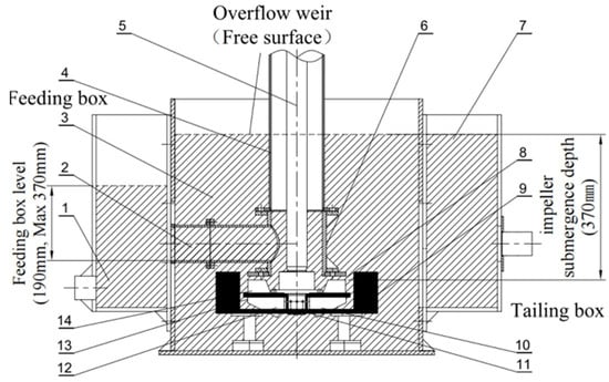 The 200 L forced-air self-aspirating flotation machine. 1. Feeding box; 2. feeding pipe; 3. flotation cell; 4. receiver; 5. main shaft (hollow); 6. center cylinder; 7. tailing box; 8. cover; 9. stator; 10. impeller; 11. air distributor; 12. lower blade; 13. spacer; and 14. upper blade.