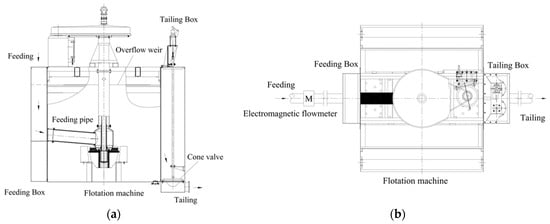 An industrial test system was established based on the largest forced-air self-aspirating flotation machine currently used in engineering applications, with a tank volume of 50 m3. This experiment system was set up at a titanium magnetite concentrator owned by the Baowu Group; it enables both hydrodynamic studies and flotation separation studies for titanium magnetite. The system mainly consists of a feeding box, a flotation machine, and a tailing box. The main parameters of the experiment system are listed in Table 3. To facilitate condition testing, the flotation machine is equipped with a variable frequency motor, with an installed power of 132 kW. The motor speed can be adjusted using a SINAMICS G120X frequency converter, manufactured by Siemens, Nanjing, China, which also measures the power consumption of the flotation machine.