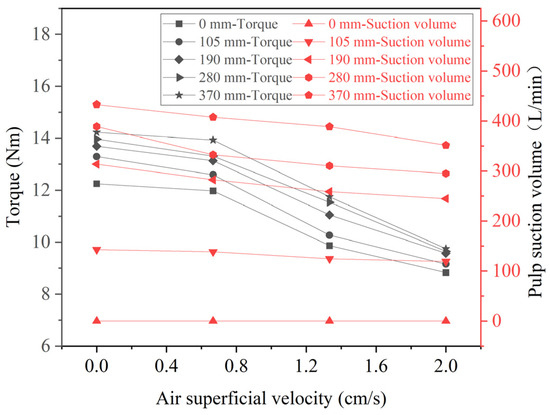Variation in torque and pulp suction with air superficial velocity (330 rpm) at different liquid levels.